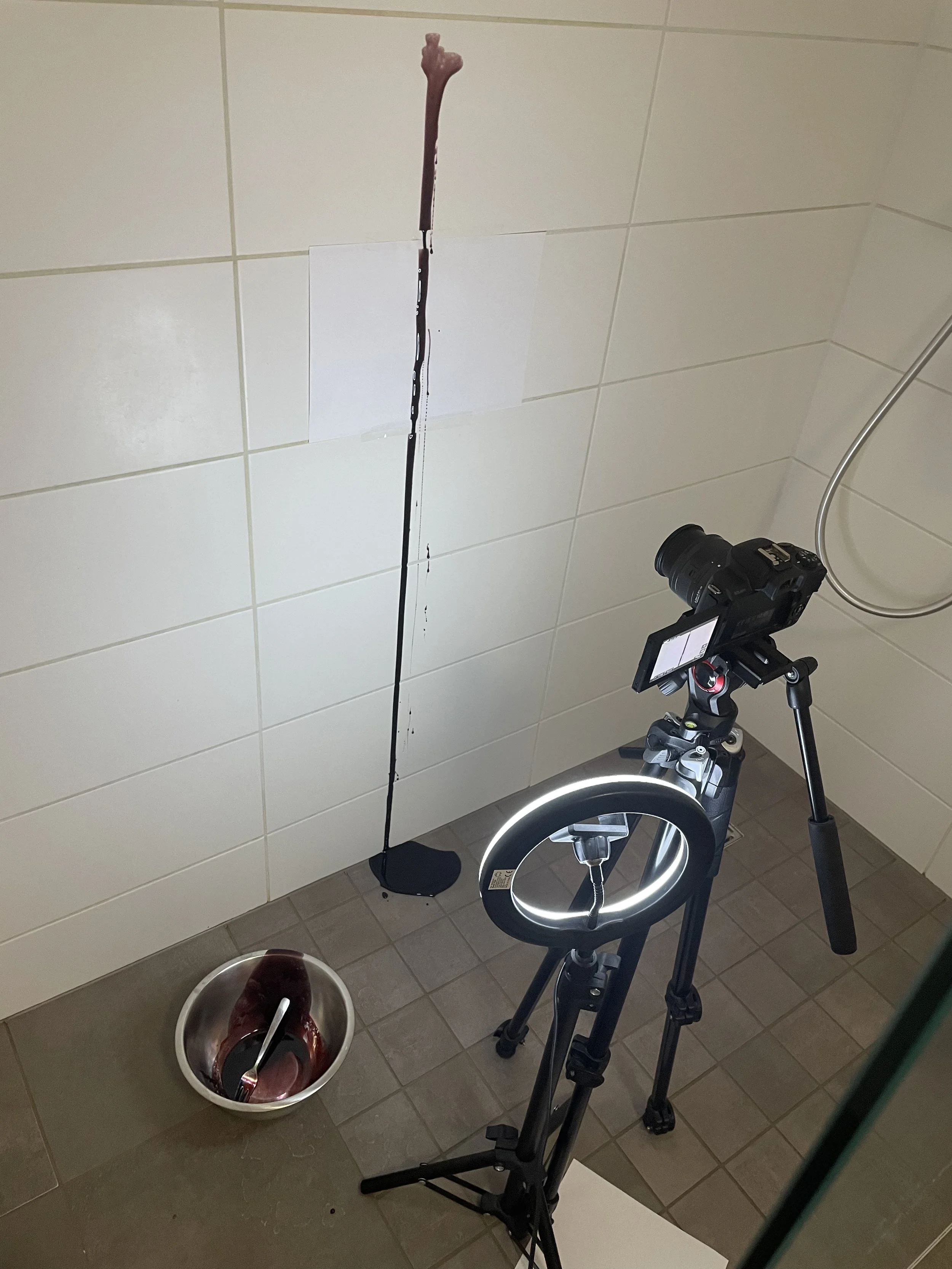 Here you see a behind the scenes photo of how I did the acid dripping effect. I again used a practical element and then changed the color and removed the background in post.